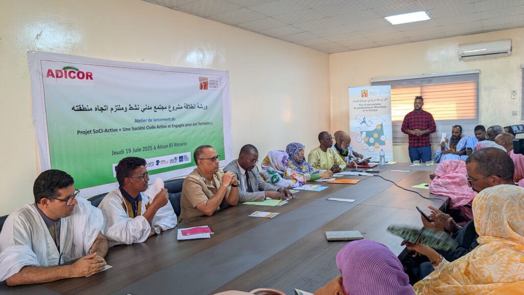 Projet SoCI-Active « Une Société Civile Active et Engagée pour son Territoire », organisé par Adicor à la région d’Aouin (Hodh El Gharbi) ce jeudi 19 juin 2025 en présence des autorités, les services techniques, les médias, et la société civile de Hodh El Gharbi membre de la plateforme régionale. Le programme a pu réunir plus de 50 personnes dont 60% de femmes actives de la sociétés civiles de la région. Ce projet a une durée de 3 ans pour appuyés la société civile de Hodh El Gharbi pour l’accompagnement des jeunes de la région.